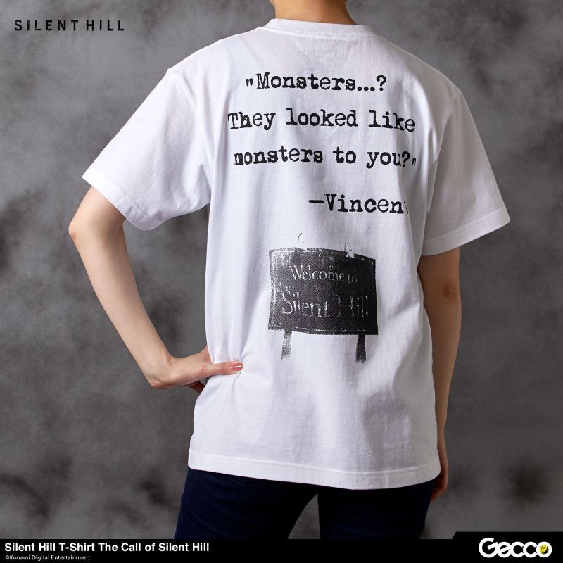"Monsters...? They looked like monsters to you?" a quote from Vincent in SILENT HILL 3 is printed on the back of the T-shirt.
